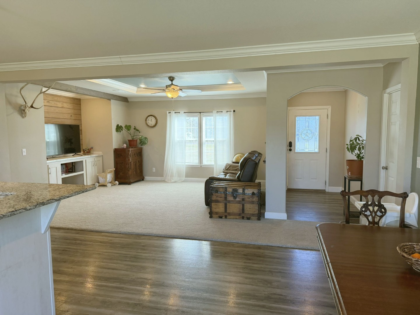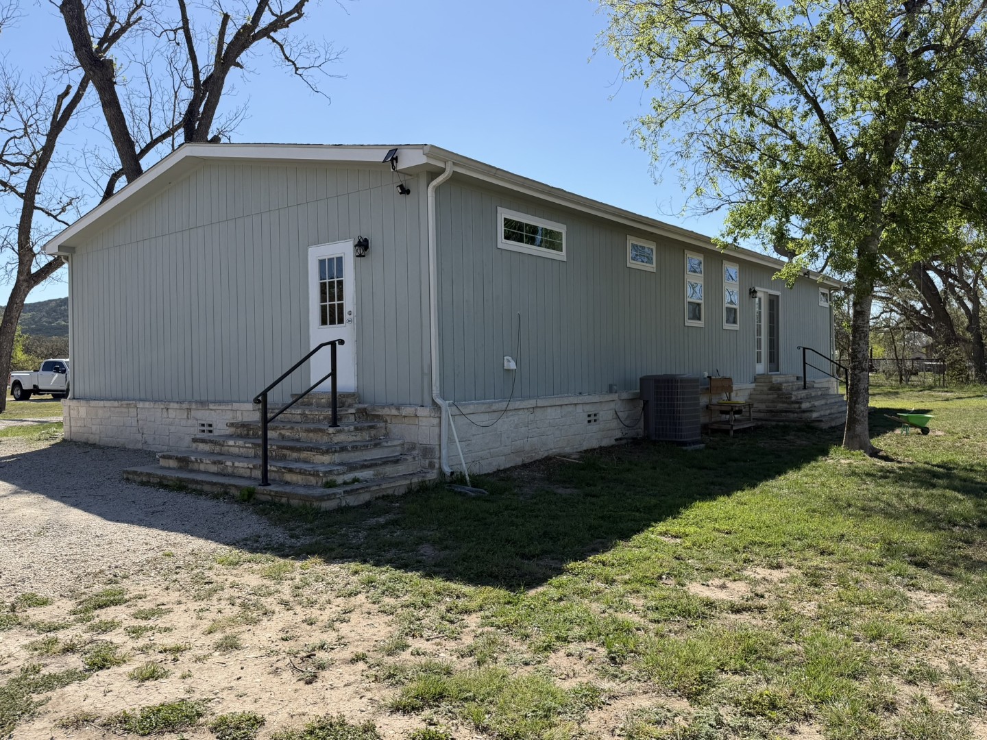 Introducing a well-maintained 3 bedroom, 2 bathroom manufactured home situated on nearly two acres. Constructed in 2016, the residence offers 1,800 square feet of living space with a split floorplan, high ceilings, new carpeting in both the living room and primary bedroom, ample storage throughout, and abundant natural light. The modern kitchen is appointed with stainless steel appliances and granite countertops. The primary bedroom includes coffered ceilings, a walk-in closet, and an ensuite bathroom featuring dual vanities, a soaking tub, and a walk-in tiled shower with glass surround. The secondary bathroom is equipped with a shower/tub combo. An oversized utility room provides a sink, additional counterspace, and enough area to accommodate an extra refrigerator or freezer. Exterior amenities include a detached 20'x22' carport with an attached storage area for lawn equipment, a new weather-proof shipping container, and a smaller storage building. A 680' deep water well was drilled and equipped in 2021. A second shallow water well with storage tank is also in place. Enjoy entertaining in the large backyard with hill country views and majestic sunsets! No HOA or annual dues. Listed at $250,000 Survey Sellers Disclosure Flood Map Floor Plan Statement of Location