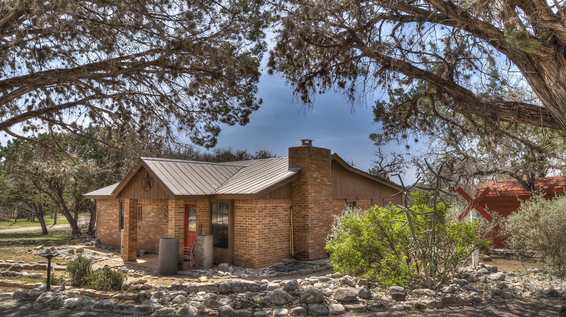 Discover Hill Country charm in this beautifully updated brick home nestled on a peaceful cul-de-sac in the gated community of Twin Forks Estates. Featuring 2 spacious bedrooms and 2 bathrooms, this home is situated on just under an acre with mature Live Oaks, Cenizo, Junipers, and Mountain Laurel, creating a tranquil, natural setting. The updated kitchen gives elevated Frio River vibes and features a gorgeous tile backsplash, all-new countertops, cabinetry, sink, and stainless-steel appliances—perfect for any home chef. The bright and airy main living area centers around a cozy wood-burning fireplace, ideal for relaxing evenings. Both bedrooms offer generous space for comfort and flexibility. A versatile bonus room addition serves as a second living area, home office, or easily convert it into a third bedroom to suit your needs. Enjoy outdoor dining or quiet mornings on the spacious deck, taking in views of the singing birds and roaming deer. The large, fenced backyard offers a secure place for pets, with plenty of room to add a shop or guest quarters beyond. Additional features include an 8x10 metal storage building for tools and lawn equipment, a detached 12x20 carport with extra storage, and a separate 10x14 garage to keep your vehicles protected. Property owners in Twin Forks Estates enjoy exclusive access to one of the most coveted stretches of the Frio River—ideal for swimming, fishing, or simply taking in the serene surroundings. Experience the perfect blend of privacy, natural beauty, and community amenities in your new Hill Country home!