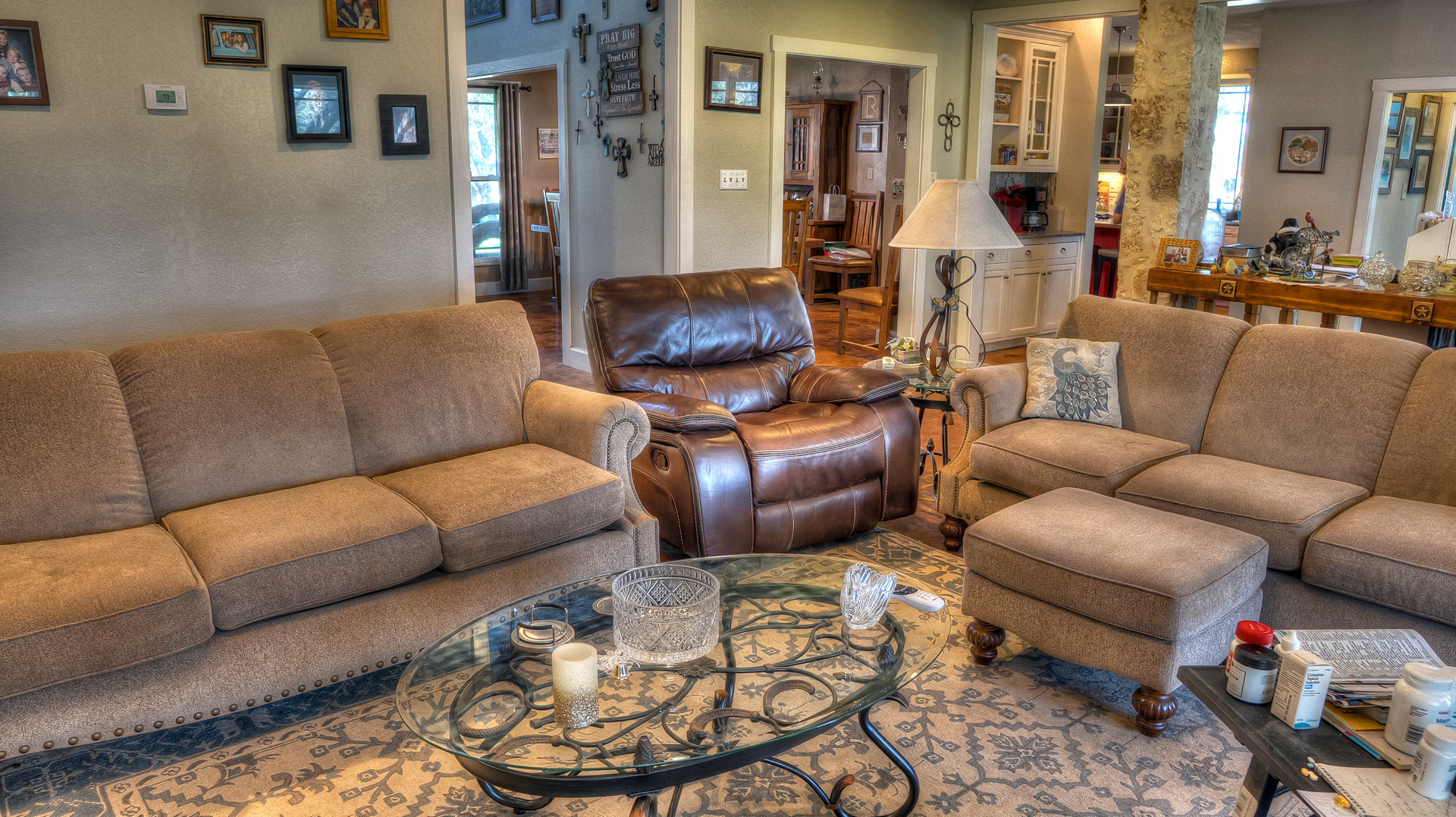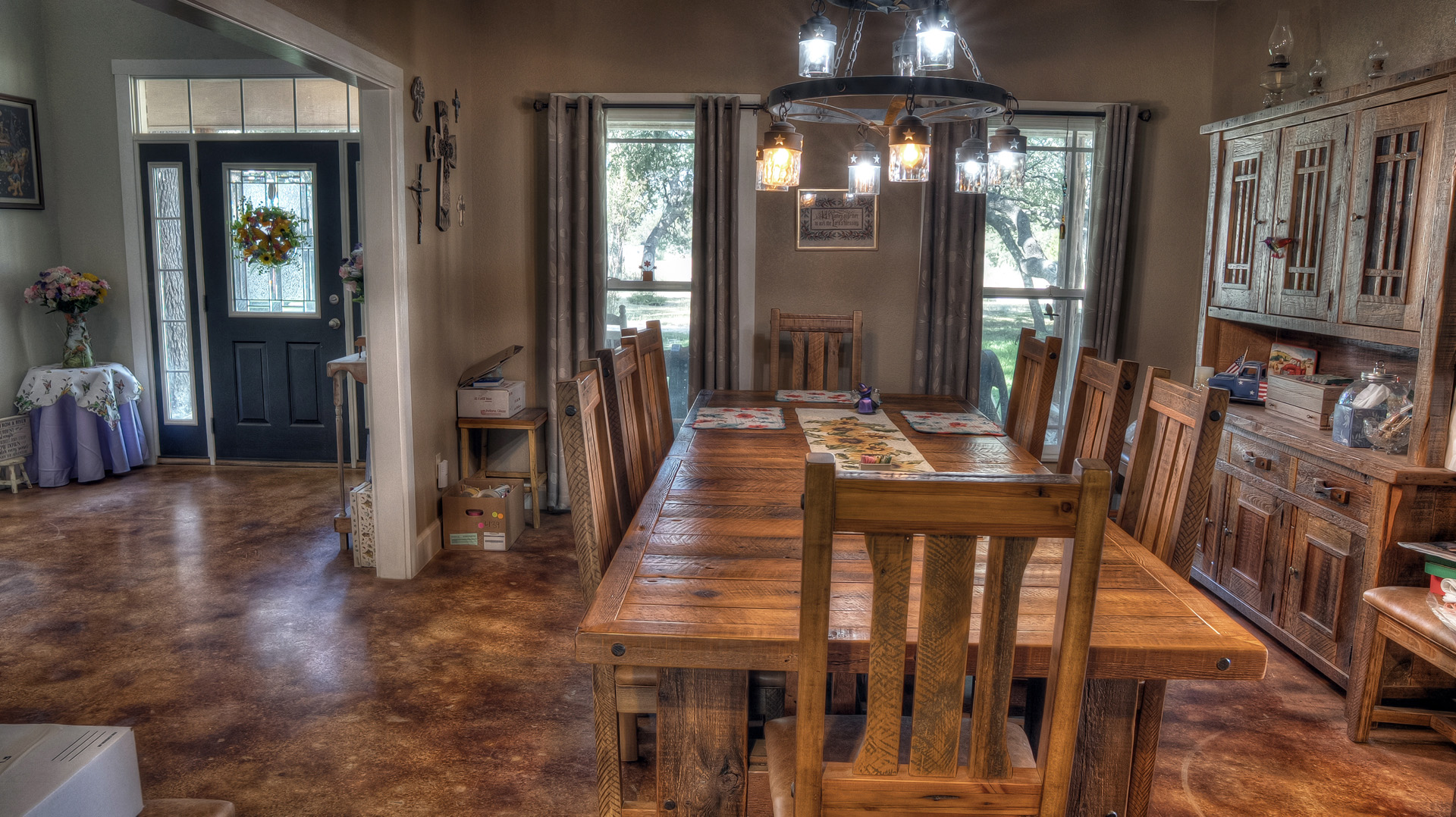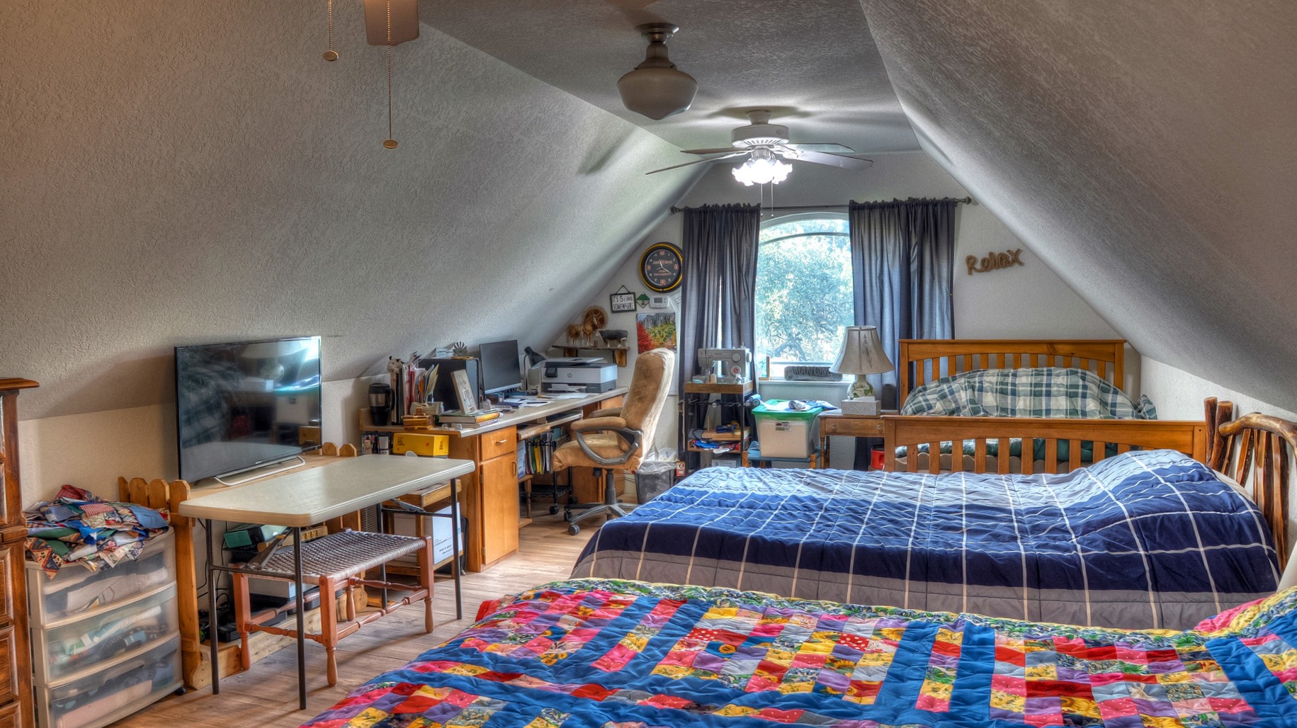 Experience the best of country living in this beautiful, spacious home set on a sprawling 7.49 acre estate. Built in 2003, this two-story home offers five bedrooms and three and a half bathrooms across 3,144 square feet of living space. Highlights inside include high ceilings, stained concrete floors, whole-home audio, a breakfast nook, formal dining room, a downstairs bedroom/office, two bedrooms with a bathroom upstairs, and another bedroom with ensuite bathroom above the garage. The large primary suite features French doors opening to the back patio and an ensuite bathroom with a walk-in closet, soaking tub, tiled shower, and dual vanities. There’s plenty of storage with indoor closets, a partially finished attic, an attached two-car garage, a portable storage building, a detached one-car garage, and a workshop. The level, fenced property is ideal for horses or 4H/FFA agricultural projects. A circle drive, a garden, and an open field grace the front of the property, while numerous oak trees provide shade around the home. Utilities include water from two wells, underground electricity, and an RV hook-up. Select furnishings are included. No deed restrictions or HOA.