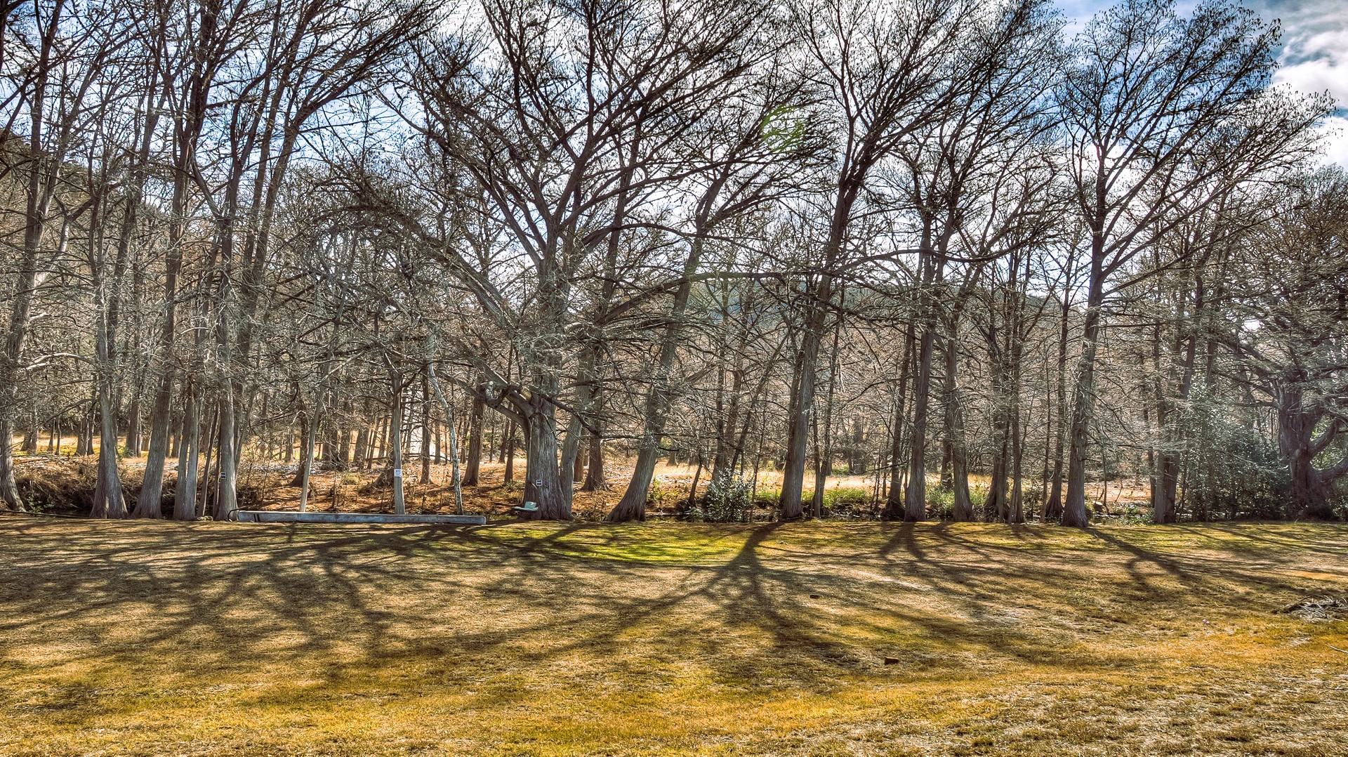 • Lush, grass-lined riverbank creating a park-like setting
